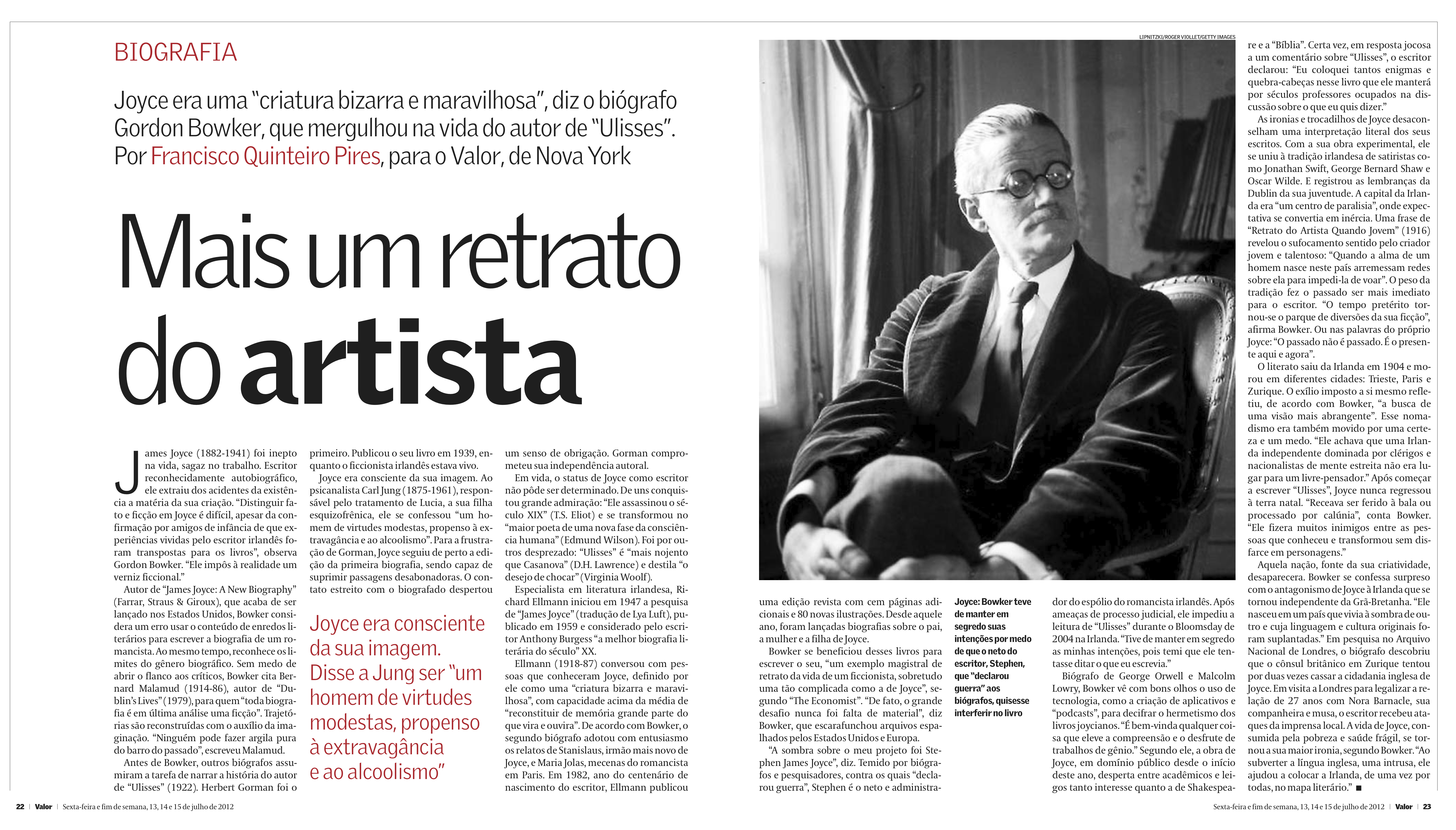 Leia texto sobre a nova biografia do James Joyce escrita por Gordon Bowker. Publicado pelo jornal Valor Econômico Check a piece about a new biography of James Joyce written by Gordon Bowker. Published by Valor Econômico newspaper